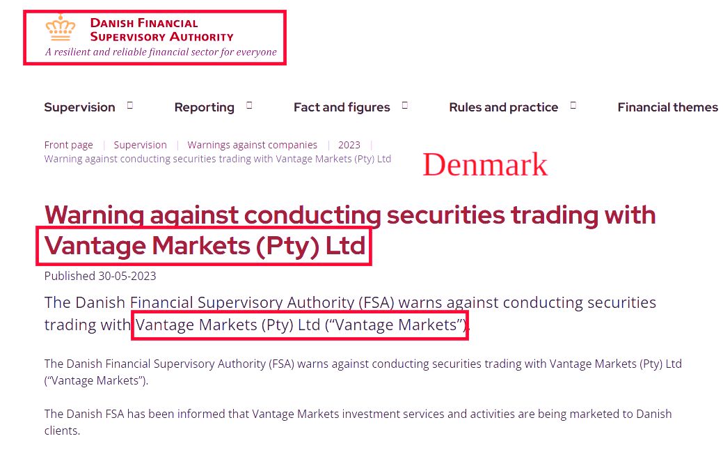 Управління з фінансового нагляду Данії попереджає про небезпеку здійснення операцій з цінними паперами через брокера з Vantage Markets (Pty) Ltd («Vantage Markets»).