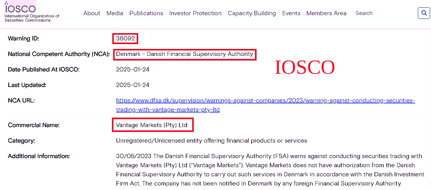 Пошук на порталі IOSCO підтвердив наші підозри: про нелегальну діяльність Vantage Markets попереджає Данія.