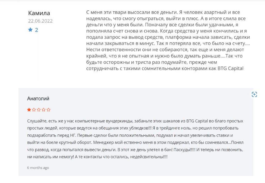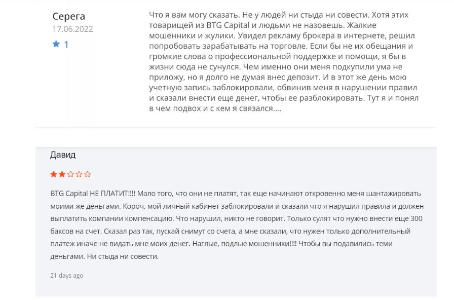 На закінчення, кілька слів про відгуки  про брокера BTG Capital. Як і багато схожих сумнівних проектів,  цей сайт  агресивно рекламується в інтернет мережі. Крім того, БТГ Кепітал намагається стежити за «репутацією», наймаючи на біржах фрілансу виконавців, які  залишають фейкові позитивні відгуки про цього брокера на спеціалізованих порталах. Також  можна зустріти різного роду замовні огляди на  псевдоблогах і форумах, які  за гроші розміщують  позитивну інформацію про брокерів-шахраїв. Якщо пошукати більш детально, можна зустріти й негативні відгуки про BTG Capital. Нижче наводимо кілька прикладів:
