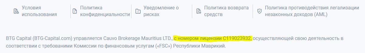 З сайту  БТГ Кепітал ми дізнаємося, що способами поповнення депозиту є банківські карти, міжнародний банківський переказ та різні крипто-методи. На сторінках проекту стверджується, що брокер регулюється Комісією з фінансових послуг Маврикія. При цьому зазначається, що послуги надаються ліцензованою компанією Cauvo Brokerage Mauritius Ltd, (вона базується в Маврикії та знаходиться в базі даних фінансового регулятора Маврикія). Зокрема, це випливає з «Умов використання», де говориться, що «…BTG Capital (далі «Компанія») контролюється та управляється Cauvo Brokerage Mauritius Ltd., компанією, що має глобальну ліцензію на ведення бізнесу та ліцензію інвестиційного дилера, видану Комісією з фінансових послуг Маврикію під номером: C119023932. Компанія працює через веб-сайт BTG-Capital.com (далі «сайт»), зареєстрований на Маврикії під номером компанії: 162428 і з операційним адресою The Core, 62 Ebene Cybercity, 72201, Маврикій.»