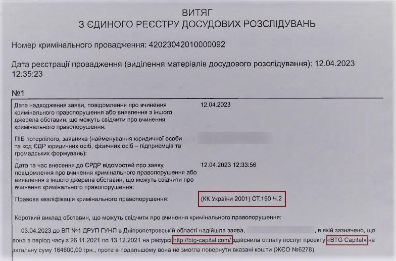 Наприкінці квітня 2023 р. щодо організаторів проєкту BTGCapital в Україні порушено кримінальну справу за ст. 190 ч.2 КК України (шахрайство, вчинене за попередньою змовою групою осіб, або таке, що завдало значної шкоди потерпілому).