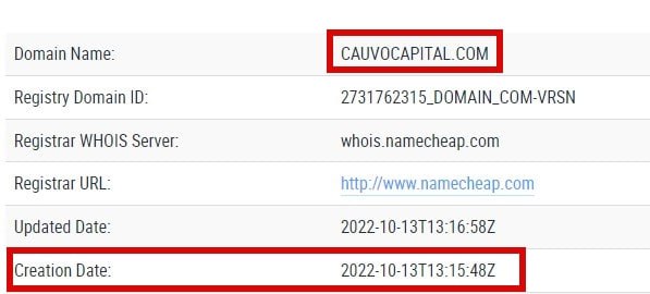 Перевірка на спеціалізованому whois-сервісі показала, що сайт cauvocapital.com було зареєстровано 13 жовтня 2022 року. Уже за цією ознакою помітно, що брокерська компанія працює недавно і не може бути названа надійною.
