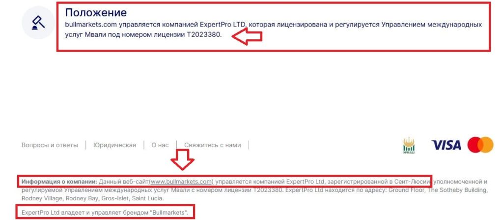 Платформа BullMarkets управляється компанією ExpertPro Ltd, зареєстрованою в Сент-Люсії (Карибський регіон). Вказується адреса: Ground Floor, The Sotheby Building, Rodney Village, Rodney Bay, Gros-Islet, Saint Lucia. Це офшорна юрисдикція з мінімальним наглядом, яка часто використовується для шахрайських схем. Різні юрисдикції (реєстрація в одній, а ліцензія в іншій)-це поширена практика шахраїв для мінімізації регуляторного контролю. Як бачите на цьому скріншоті, компанія ExpertPro Ltd зареєстрована в Сент-Люсії, але ліцензія чомусь видана на Коморських островах.