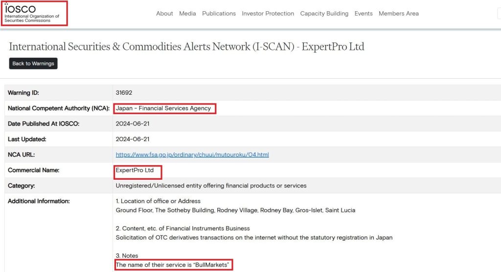 Міжнародна організація комісій з цінних паперів (IOSCO) опублікувала попередження Агентства фінансових послуг Японії про діяльність компанії ExpertPro Ltd, яка пропонує фінансові послуги без реєстрації в Японії. У попередженні повідомляється, що компанія, зареєстрована в Сент-Люсії, яка використовує торговельну назву «BullMarkets», спонукає клієнтів до укладення угод з позабіржовими деривативами в Інтернеті, що пов’язано з ризиками втрати грошей інвесторів. Попередження датоване 21 червня 2024 року.