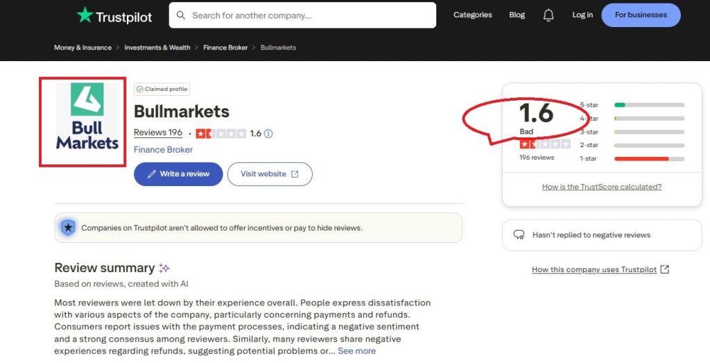 Загальний рейтинг відгуків низький (1–2 зірки на сайті Trustpilot). Більше 70% відгуків негативні. Більшість користувачів, які залишили відгуки, в цілому залишилися розчаровані своїм досвідом роботи з BullMarkets. Люди висловлюють невдоволення різними аспектами роботи компанії, особливо в частині виведення коштів. Споживачі повідомляють про одні й ті ж проблеми, що свідчить про негативне ставлення та одностайну думку.