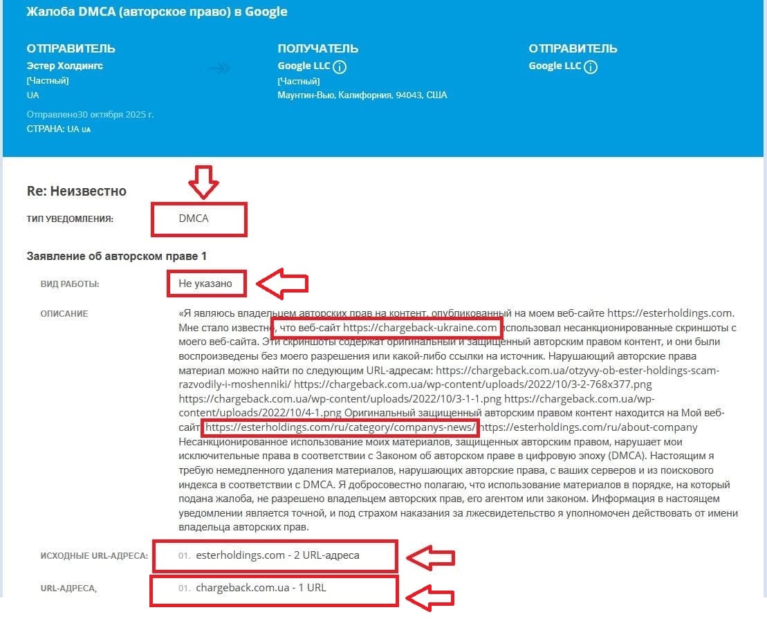 Ми звинувачуємо компанію Ester Holdings (Естер Холдингс) у спробі видалити критичні відгуки шляхом подання безпідставних скарг до Google про видалення контенту. Звертаємо вашу увагу, що це робиться не з метою спростування викладених фактів, а під приводом захисту авторського права на скріншоти, які опубліковані три роки тому в цій статті. Вважаємо, що використання формальних процедур захисту авторських прав на зображення в контексті критичних матеріалів є шахрайським механізмом придушення правдивої інформації.